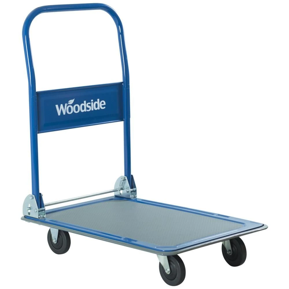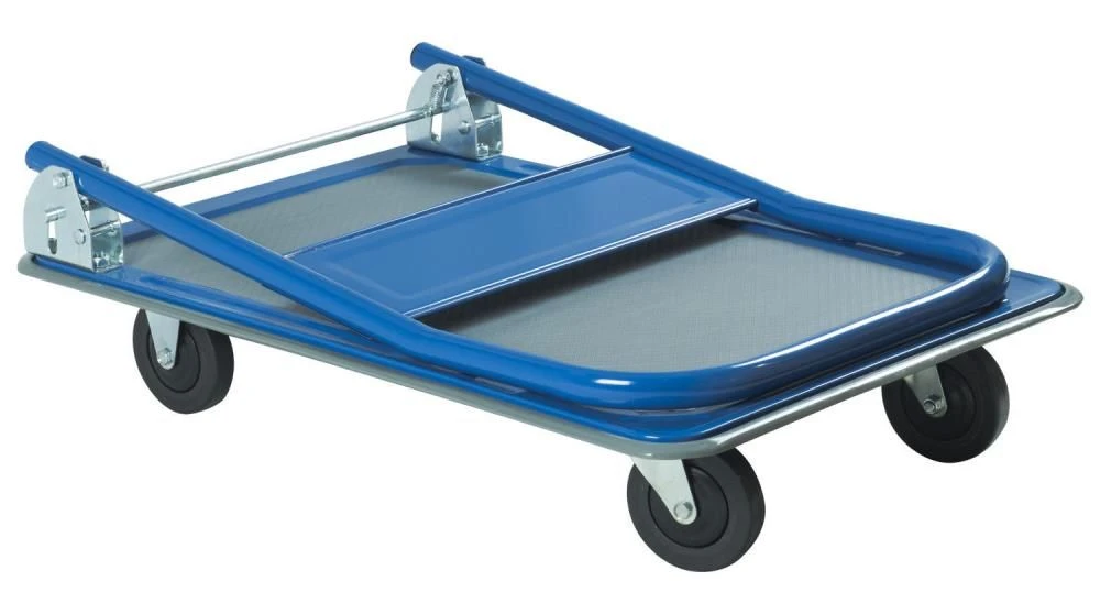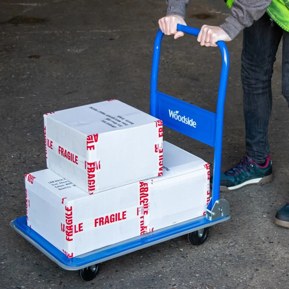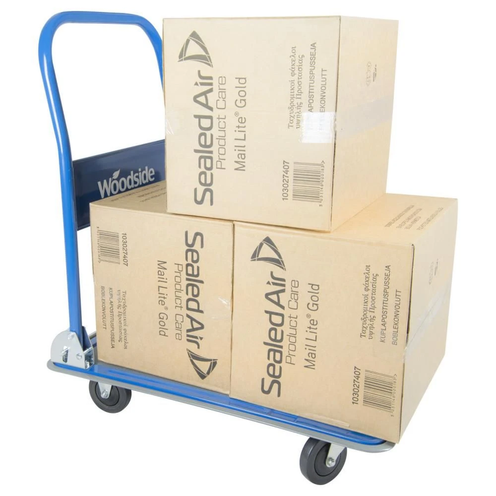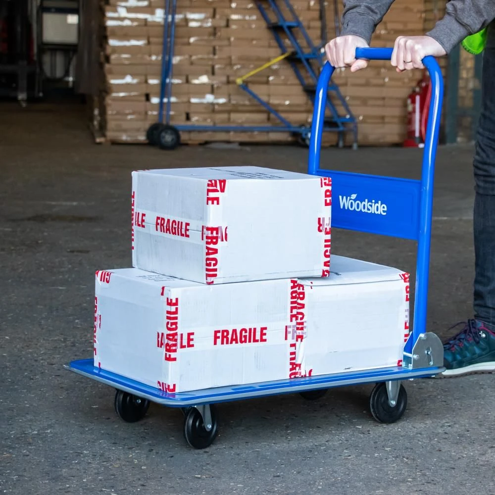 - ROBUST DESIGN – Solidly constructed blue trolley with a non-slip parcel deck, quiet running swivel castors and a fold-down handle allowing easy storage.